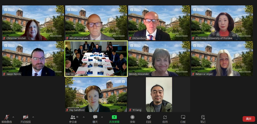 副校长黎志宏和副主任、邓迪大学副校长Wendy Alexander共同主持。JMC委员何旭辉、殷刚、高东波、高广军、易亮、Peter Fotheringham、Fordyce Davidson、Jason Norris、Karen Petrie和Rebecca Leiper出席了会议,计财处副处长曾晓勤受李家才委员委托参加会议,Judy Finlay、Christine Sinclair、Fay Sandford以及学院各科室成员列席会议。