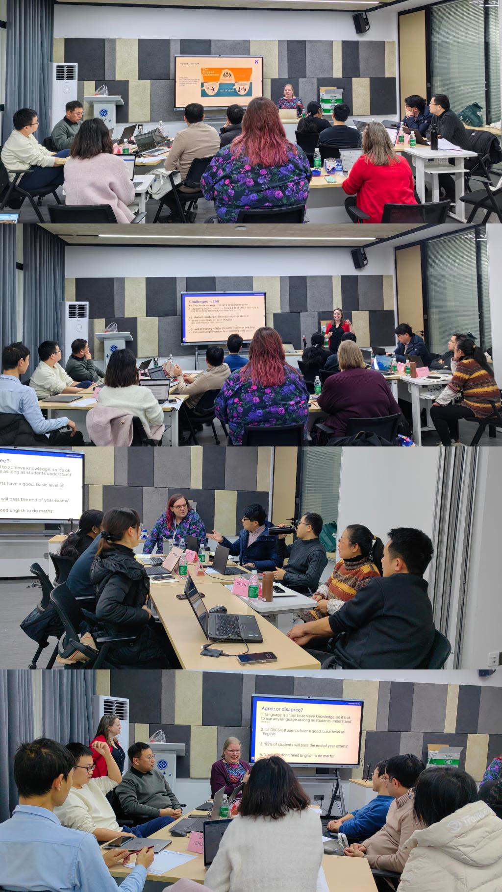 培训围绕英国高等教育及质量保障体系、主动混合式教学方法、全英文教学、My dundee系统使用、课堂互动、课程考核、课程大纲、学术行为不当认定、特殊事由申请等主题,以要点讲解、小组讨论、个人分享、案例分析等形式,让教师沉浸式体验学院课程设计、授课方法等。