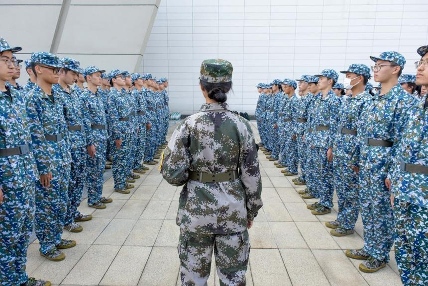 的24级新生们迎来了第五天的训练。在体育场前坪,三营十三连吹响了训练的号角。