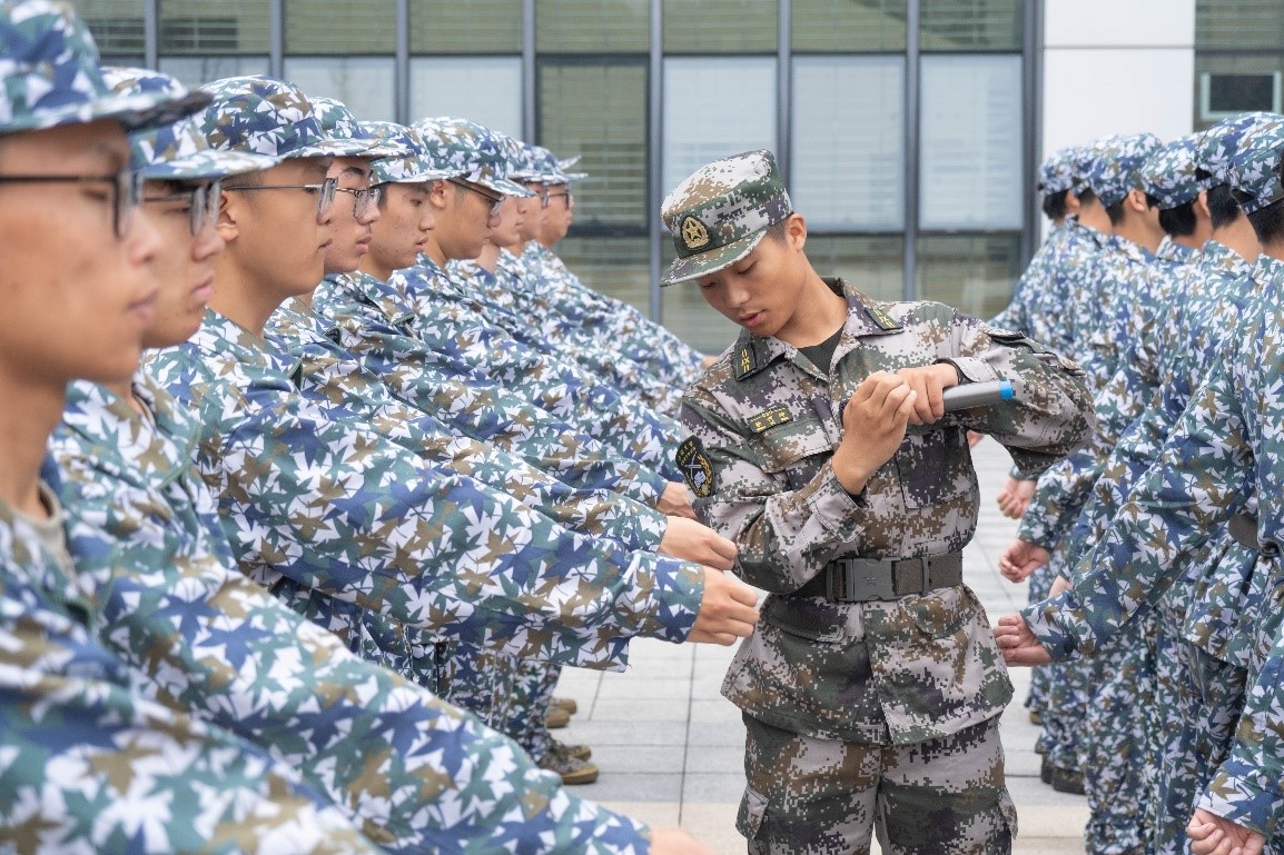 例行军姿训练后,连长排长开始组织对应训练内容。分列式动作看似简单,但它不仅需要毅力,更需要所有人的默契配合。匕首操方阵练习“横砍捅刺”动作,教官们精心示范,同学们则认真观看,领悟动作要领,最后练习巩固。