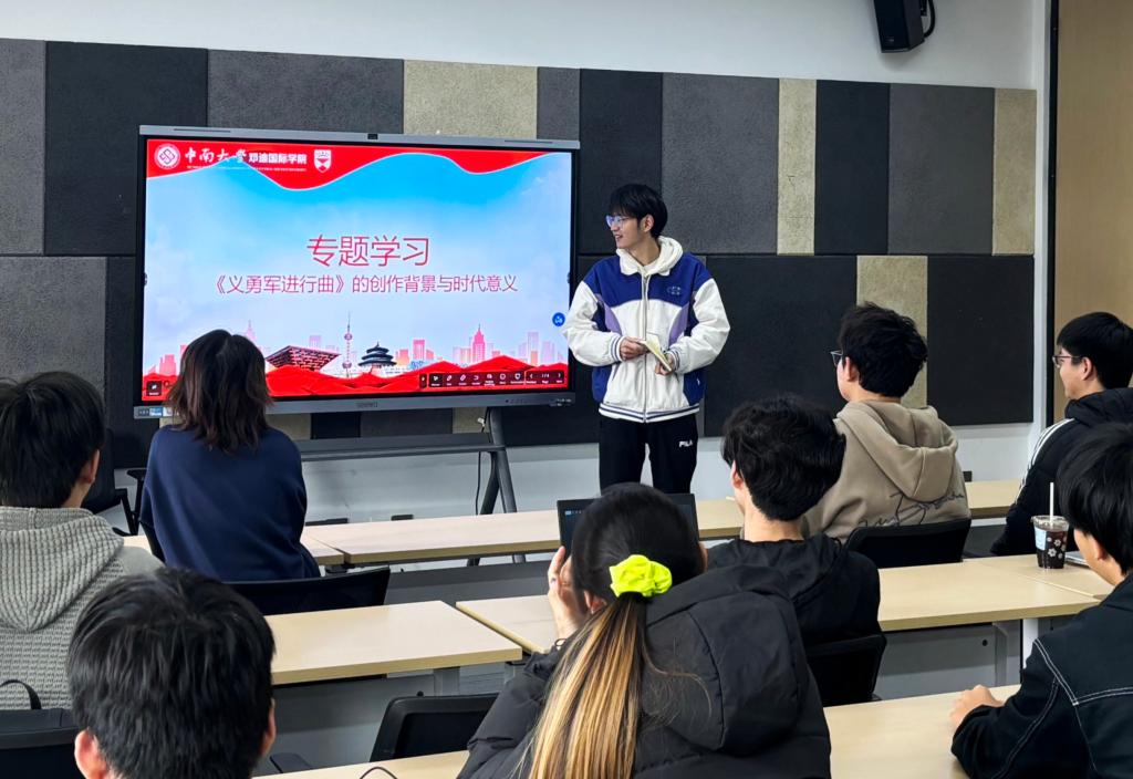 首先,曹阳向大家介绍了国歌《义勇军进行曲》的创作背景与时代意义,结合影像资料与历史文献,系统梳理国歌从抗战烽火中诞生到成为国家象征的光辉历程。在场师生通过观看珍贵档案复刻件照片、聆听创作故事,深刻感悟国歌承载的民族精神与爱国情怀。