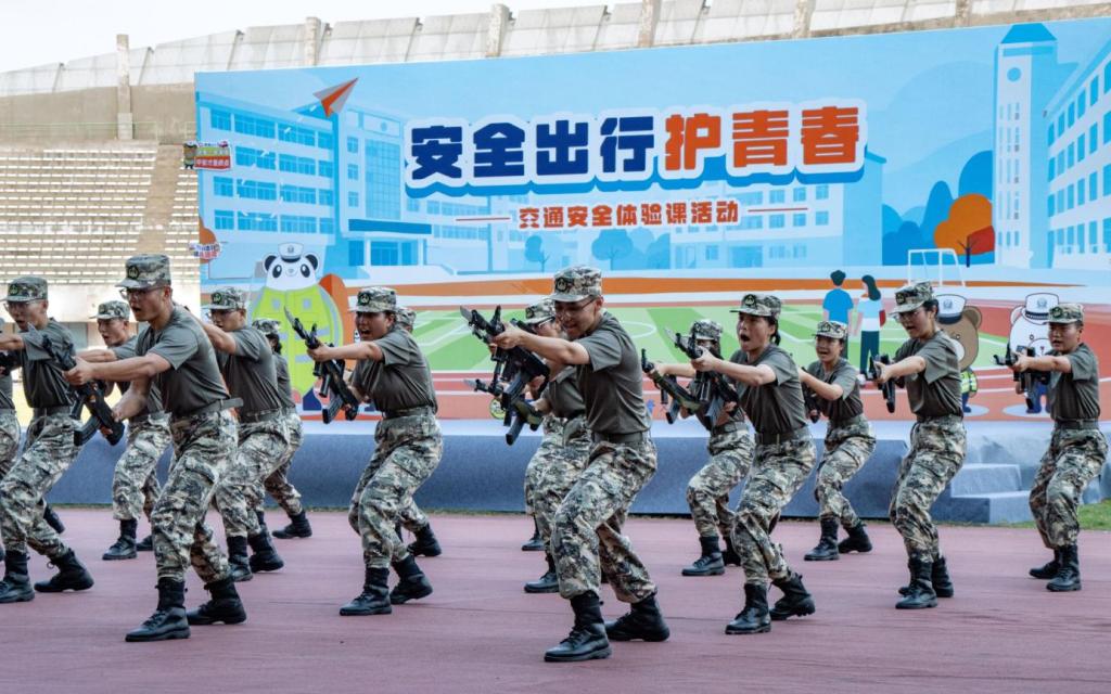 下午三时,军训动员大会在潇湘校区体育场隆重举行。教官们进行了精彩的科目展示,仪仗队整齐划一,刺杀操刚猛迅疾,形体拳气势如虹,都赢得了同学们热烈而持久的掌声。随后开展的是交通安全教育大会,不仅有脱口秀环节让同学们在欢声笑语中体会到遵守交规的重要性,更有人气交警亲临现场,以实况模拟、你画我猜、趣味竞赛等活动调动同学们的积极性,让同学们既收获了欢乐也学习了知识。