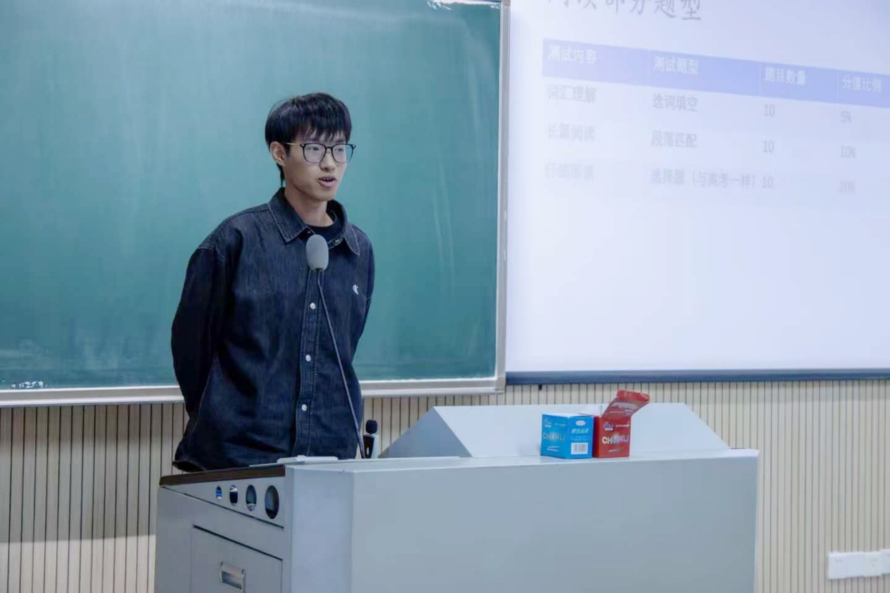 张子涵强调了四级考试的重要性,鼓励大家提高对考试的重视程度。她结合自身备考经验,重点分享了写作、听力两部分的应试策略。针对写作,她建议同学们按照判断作文类型、搭建框架、填充内容和检查修正的步骤进行训练,并多积累高级句式以提升写作水平。针对听力,她指出其难度较高中阶段有明显提升,需通过日常练习提升语感,掌握抓取关键词、内容预判等听力技巧,培养未听清时果断跳过的做题策略。盛钧泓就阅读和翻译部分展开讲解。在阅读方面,他建议同学们遵循“仔细阅读、信息匹配、选词填空”的答题顺序,以在有限时间内争取更高分数。他还带领同学们现场演练了一篇阅读真题,帮助大家感受考场氛围和题目难度。对于翻译,他强调应遵循“信达雅”的原则,确保原文意思完整传达,句式尽量灵活多变,并在能力范围内使用准确、高级的词汇,从而有效提升得分。