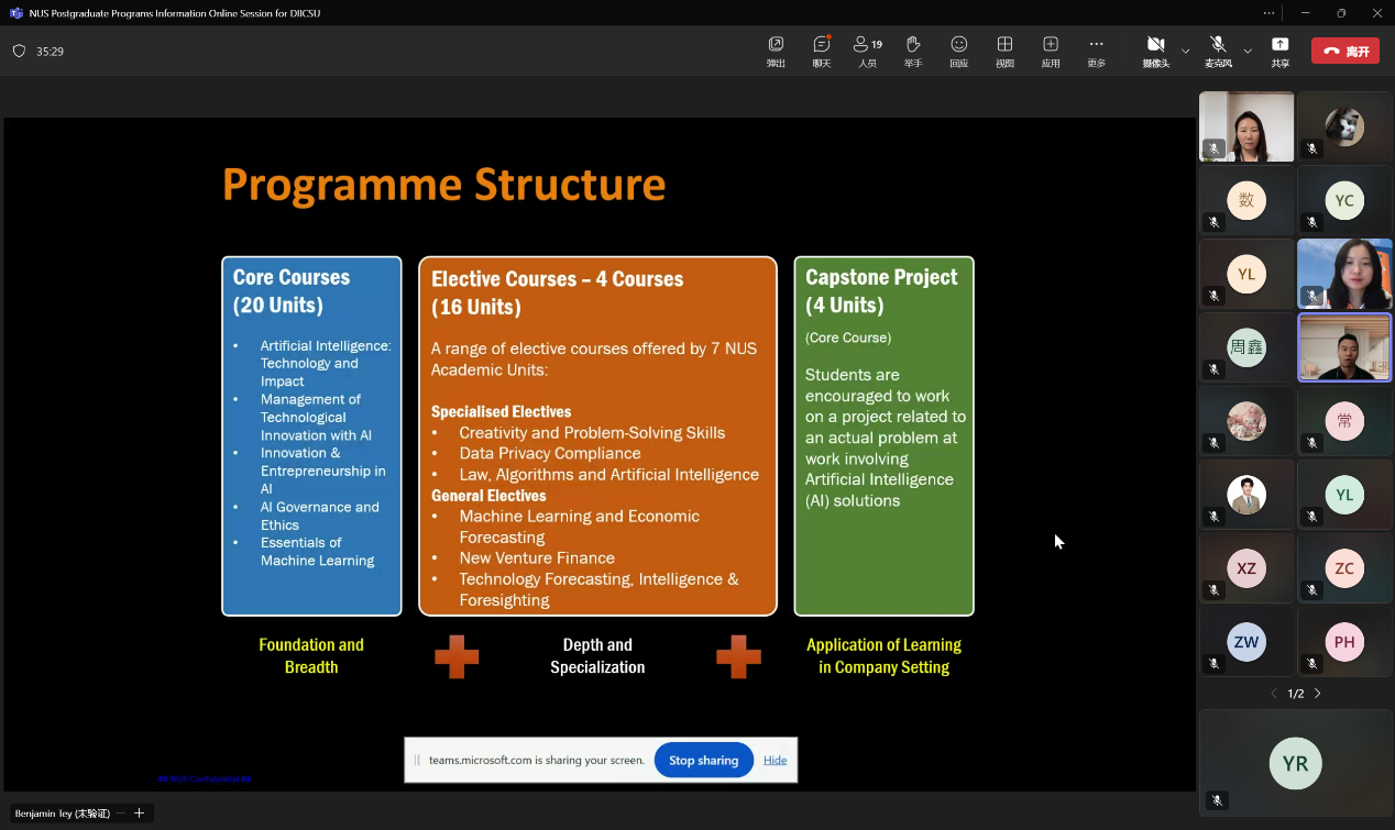4月28日晚,新加坡国立大学硕士研究生项目宣讲会成功在线上举办。本次宣讲由新加坡国立大学国际学生招生负责人Benjamin Tey(郑伟贤)担任主讲人。Benjamin Tey简要介绍了新加坡国立大学的基本情况、建校历史、优势学科和学生生活,着重提到了与工业4.0、数字经济、创新产业、护理经济、绿色经济等主题相关的授课型硕士项目,并以人工智能和创新硕士项目(MSc Artificial Intelligence & Innovation)为例,帮助同学们深入了解课...